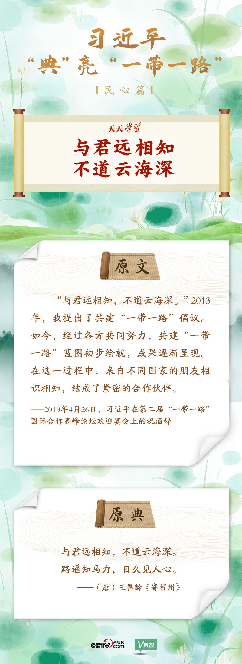 在國內(nèi)國際多個(gè)重要場合,習(xí)近平主席頻頻引經(jīng)據(jù)典,介紹“一帶一路”承載的厚重歷史,闡述“一帶一路”建設(shè)的理念和重大意義,描繪“一帶一路”美好的發(fā)展愿景。央視網(wǎng)《天天學(xué)習(xí)》欄目特選取習(xí)近平主席的部分用典,與您一起學(xué)習(xí)領(lǐng)會(huì)。