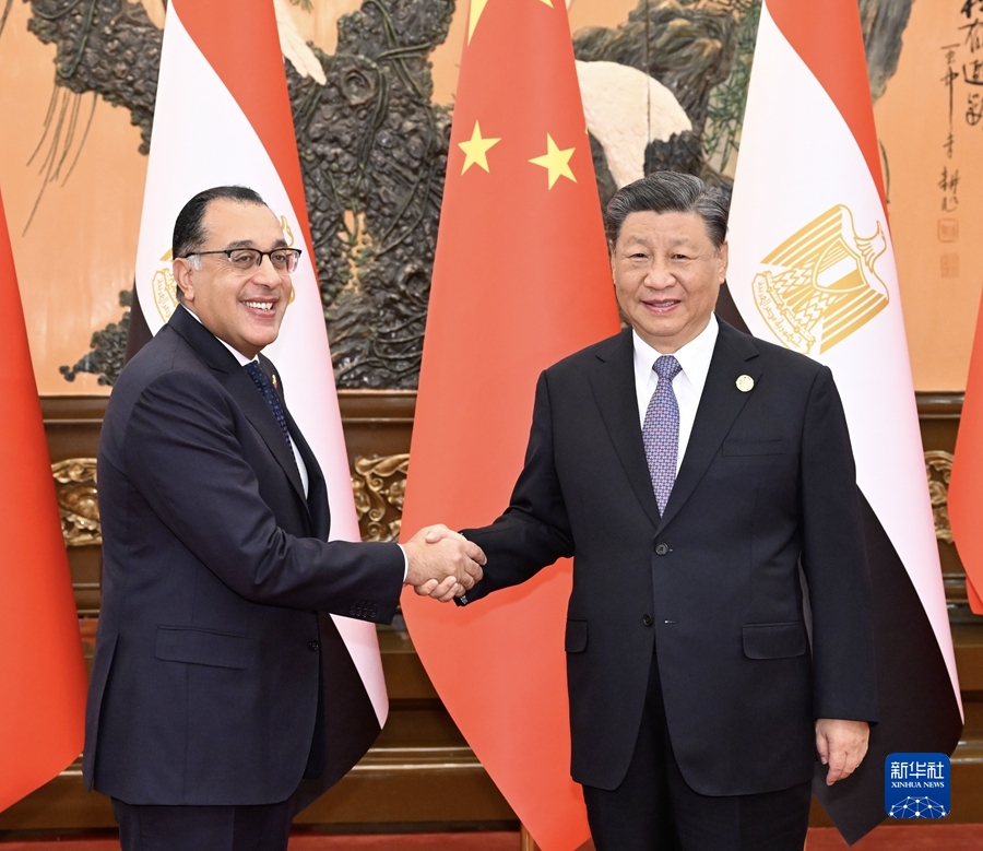 10月19日上午,國家主席習近平在北京人民大會堂會見來華出席第三屆“一帶一路”國際合作高峰論壇的埃及總理馬德布利。