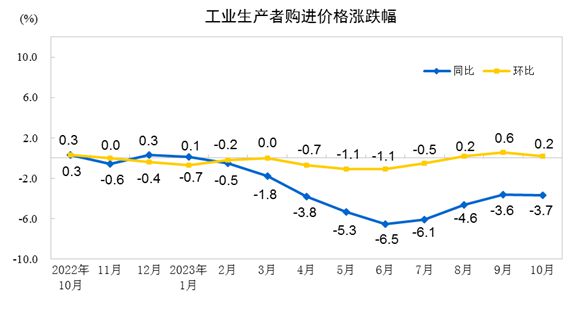 中新網(wǎng)11月9日電 據(jù)國家統(tǒng)計局網(wǎng)站消息,2023年10月份,全國工業(yè)生產(chǎn)者出廠價格同比下降2.6%,環(huán)比持平;工業(yè)生產(chǎn)者購進價格同比下降3.7%,環(huán)比上漲0.2%。1—10月平均,工業(yè)生產(chǎn)者出廠價格比上年同期下降3.1%,工業(yè)生產(chǎn)者購進價格下降3.6%。