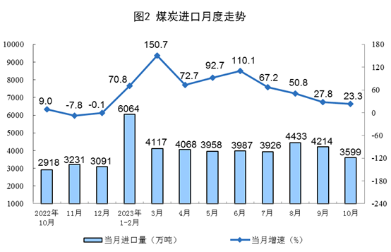 原煤生產(chǎn)增速加快,進(jìn)口較快增長。10月份,生產(chǎn)原煤3.9億噸,同比增長3.8%,增速比9月份加快3.4個百分點,日均產(chǎn)量1254.0萬噸。進(jìn)口煤炭3599萬噸,同比增長23.3%,增速比9月份回落4.5個百分點。