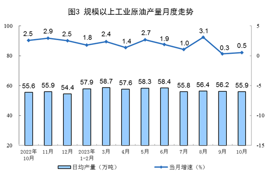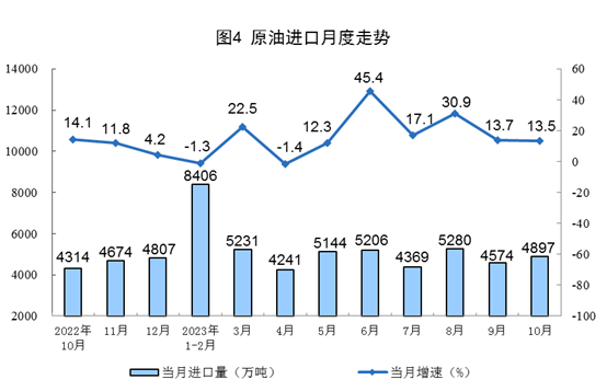 原油生產(chǎn)增速略有加快,進(jìn)口保持較快增長。10月份,生產(chǎn)原油1733萬噸,同比增長0.5%,增速比9月份加快0.2個百分點,日均產(chǎn)量55.9萬噸。進(jìn)口原油4897萬噸,同比增長13.5%,增速比9月份放緩0.2個百分點。