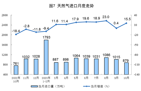 天然氣生產(chǎn)保持平穩(wěn),進(jìn)口增速加快。10月份,生產(chǎn)天然氣190億立方米,同比增長2.6%,增速比9月份回落6.7個百分點,日均產(chǎn)量6.1億立方米。進(jìn)口天然氣879萬噸,同比增長15.5%,增速比9月份加快15.1個百分點。