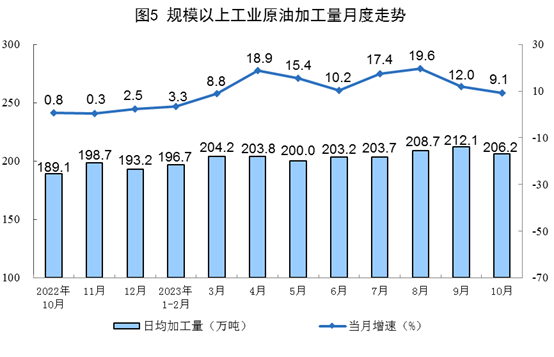原油加工保持穩(wěn)定增長。10月份,加工原油6393萬噸,同比增長9.1%,增速比9月份放緩2.9個百分點,日均加工原油206.2萬噸。1—10月份,加工原油61876萬噸,同比增長11.2%。