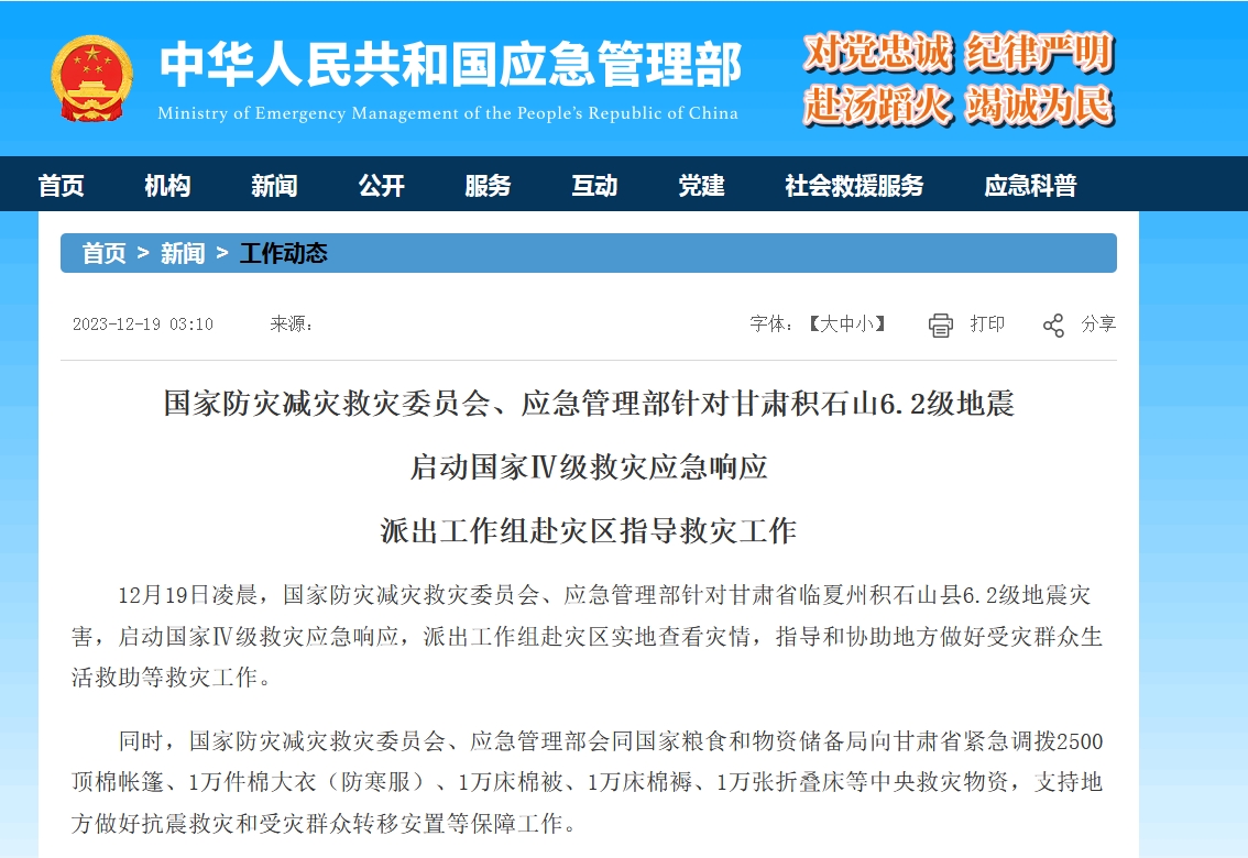 中新網(wǎng)12月19日電 據(jù)應(yīng)急管理部網(wǎng)站消息,12月19日凌晨,國(guó)家防災(zāi)減災(zāi)救災(zāi)委員會(huì)、應(yīng)急管理部針對(duì)甘肅省臨夏州積石山縣6.2級(jí)地震災(zāi)害,啟動(dòng)國(guó)家Ⅳ級(jí)救災(zāi)應(yīng)急響應(yīng),派出工作組赴災(zāi)區(qū)實(shí)地查看災(zāi)情,指導(dǎo)和協(xié)助地方做好受災(zāi)群眾生活救助等救災(zāi)工作。