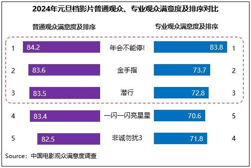 2024年元旦檔調(diào)查的5部影片中,單片滿意度前三的影片在普通觀眾和專業(yè)觀眾評(píng)價(jià)中的排序保持一致,而居單片滿意度后兩位的影片排序則有所差異,展現(xiàn)出不同細(xì)分觀眾群體的觀影審美差異。