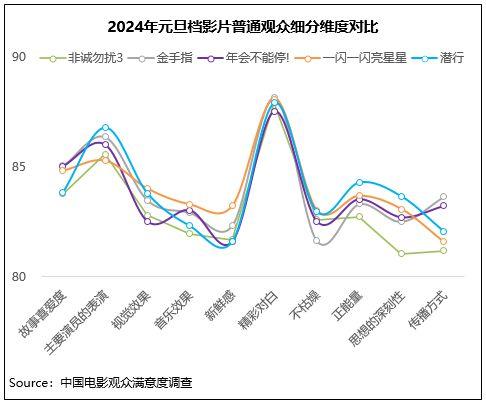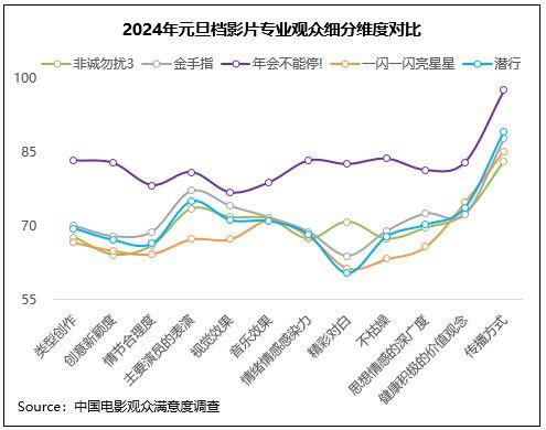 中國(guó)電影觀眾滿意度調(diào)查 2024年元旦檔調(diào)查結(jié)果顯示,元旦檔電影觀眾滿意度得分83.0分,環(huán)比增長(zhǎng)0.2分。檔期以多元化且高契合度的影片供給陪伴觀眾跨年,得到了較高的滿意度評(píng)價(jià),5部影片中有4部進(jìn)入歷史調(diào)查19部元旦檔影片的滿意度前十,喜劇《年會(huì)不能停!》以84.2分領(lǐng)銜,《金手指》83.0分居第二位,《潛行》《一閃一閃亮星星》均超82分,《非誠(chéng)勿擾3》超81分。
