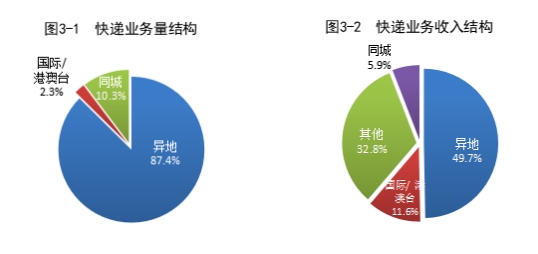 2023年,同城、異地、國際/港澳臺快遞業(yè)務(wù)量分別占全部快遞業(yè)務(wù)量的10.3%、87.4%和2.3%;業(yè)務(wù)收入分別占全部快遞收入的5.9%、49.7%和11.6%。與去年同期相比,同城快遞業(yè)務(wù)量的比重下降1.3個百分點(diǎn),異地快遞業(yè)務(wù)量的比重上升0.8個百分點(diǎn),國際/港澳臺業(yè)務(wù)量的比重上升0.5個百分點(diǎn)。
