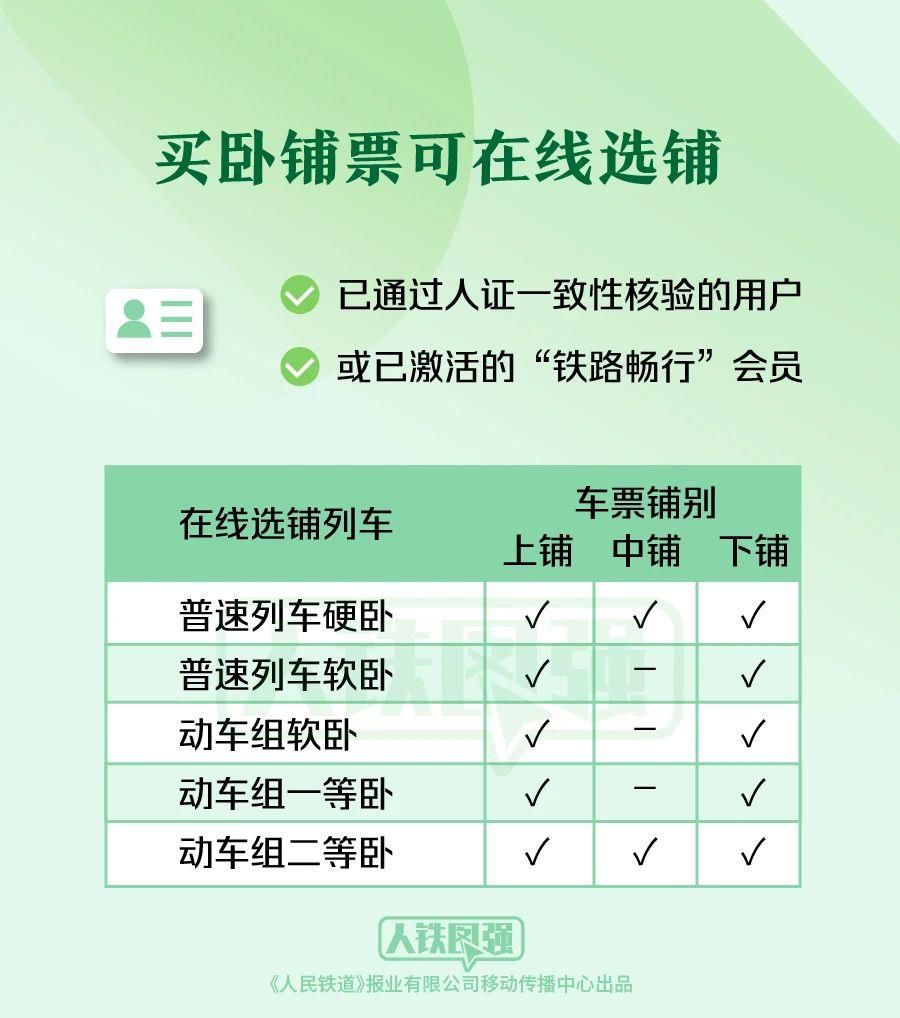 旅客在鐵路12306網(wǎng)站和App上購買臥鋪車票時,普速列車軟臥、硬臥和動車組軟臥、一等臥、二等臥等鋪別可在線自主選鋪。