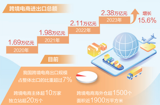 據(jù)海關(guān)測算,2023年,我國跨境電商進(jìn)出口總額2.38萬億元,增長15.6%。其中,出口1.83萬億元,增長19.6%;進(jìn)口5483億元,增長3.9%??缇畴娚炭焖侔l(fā)展,既滿足了國內(nèi)消費者多樣化個性化需求,又助力我國產(chǎn)品通達(dá)全球,成為外貿(mào)發(fā)展的重要動能。