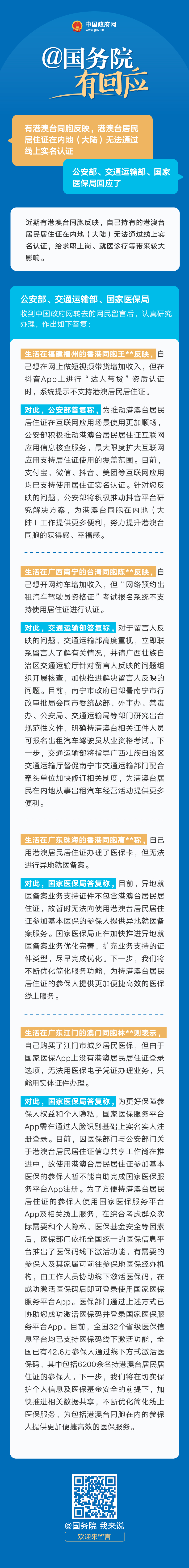 公安部、交通運(yùn)輸部、國(guó)家醫(yī)保局答網(wǎng)民關(guān)于“加快推進(jìn)港澳臺(tái)居民居住證線上實(shí)名認(rèn)證”的留言