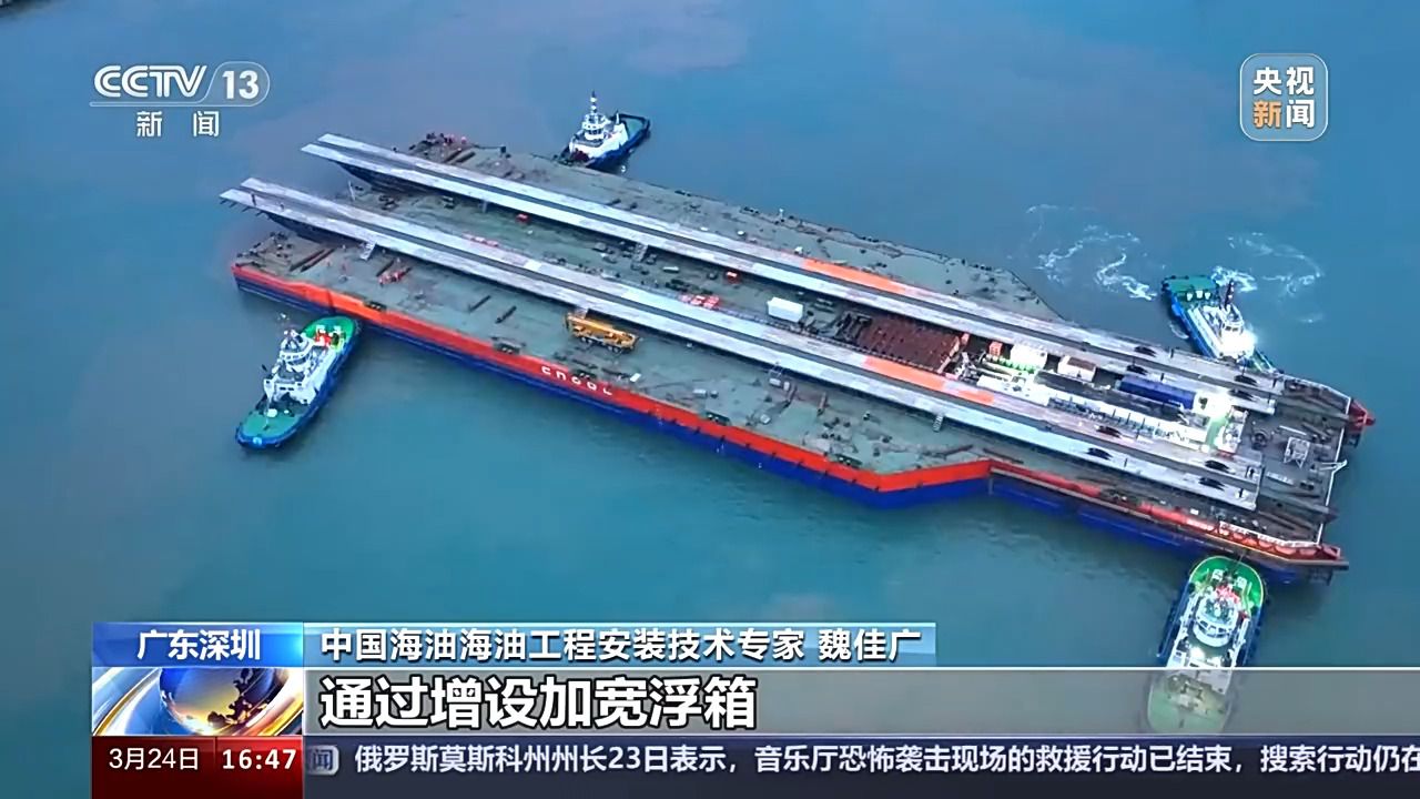 總臺(tái)央視記者 古峻嶺:這里是位于深圳東南方向240多公里處的流花油田海域,我們現(xiàn)在看到的這個(gè)大家伙,就是搭乘亞洲最大下水駁船——海洋石油229的?;?hào)深海導(dǎo)管架。它相當(dāng)于海上平臺(tái)穩(wěn)穩(wěn)矗立在海底的“大長腿”,用鋼量接近于一整個(gè)“鳥巢”國家體育館。它是從廣東珠海出發(fā),經(jīng)過40多個(gè)小時(shí)的長距離拖航,剛剛抵達(dá)這一片施工海域。目前正在進(jìn)行海上安裝前最后的準(zhǔn)備工作。