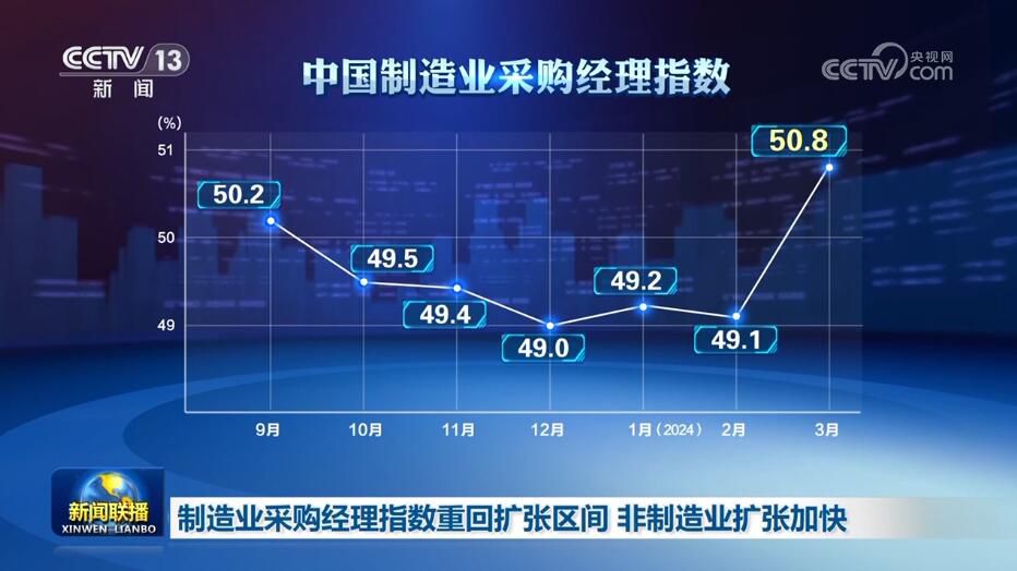 央視網(wǎng)消息:3月31日,《新聞聯(lián)播》報(bào)道了3月份中國采購經(jīng)理指數(shù)、各地重大工程建設(shè),以及生態(tài)保護(hù)、春耕等領(lǐng)域取得的新成績(jī)、新成果,各行各業(yè)奮力拼搏,匯聚成向上的蓬勃力量,繪就出中國經(jīng)濟(jì)萬千氣象。