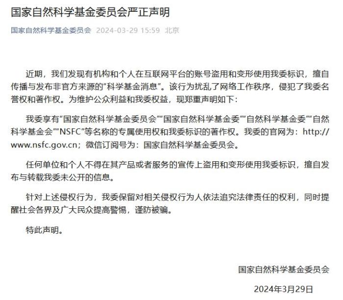 為維護公眾利益和國家自然科學(xué)基金委員會權(quán)益,國家自然科學(xué)基金委員會鄭重聲明如下: