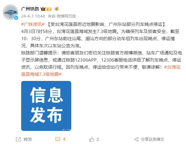 中新網(wǎng)4月3日電 據(jù)中國鐵路廣州局集團(tuán)有限公司官方微博消息,4月3日7時58分,臺灣花蓮縣海域發(fā)生7.3級地震。為確保列車及旅客安全,截至10:30分,廣州東站前往汕尾、潮汕方向的部分動車組列車出現(xiàn)晚點、停運(yùn)情況,具體車次以車站公告為準(zhǔn)。