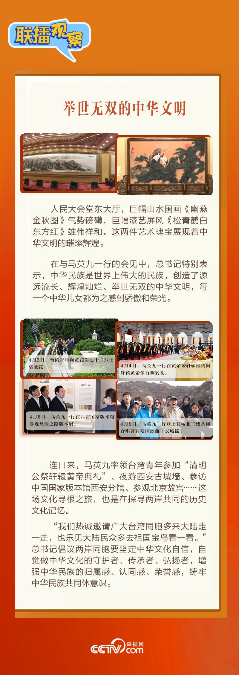 |聯(lián)播+| 4月10日下午,習(xí)近平總書記在北京人民大會堂會見馬英九一行。東大廳巨幅座屏前,習(xí)近平總書記與馬英九微笑握手。這是黨的二十大后,總書記首次會見臺灣同胞。