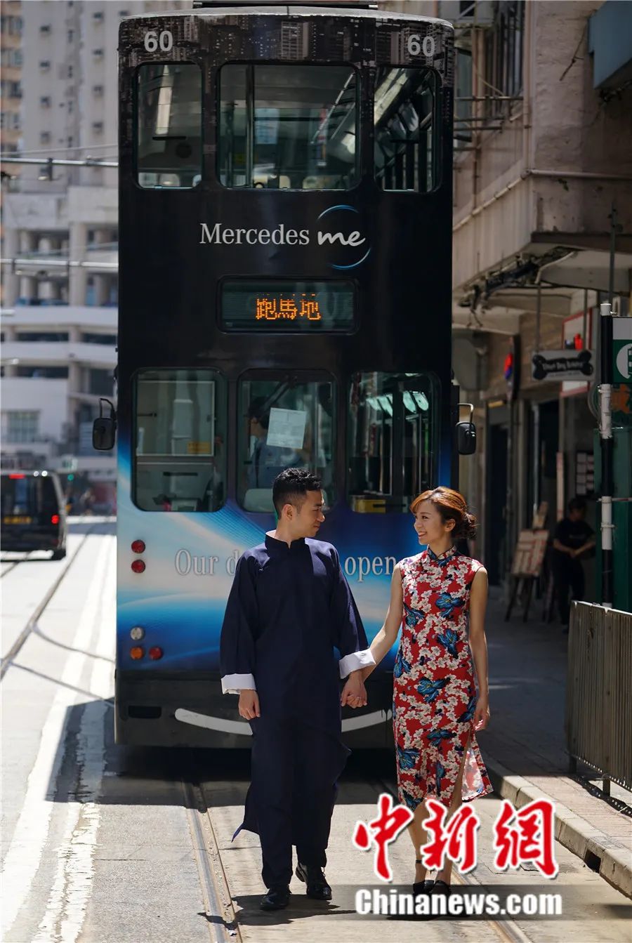 年輕情侶在叮叮車前合影。中新社記者 張煒 攝