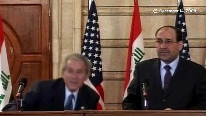 2008年12月,時(shí)任美國(guó)總統(tǒng)小布什在伊拉克首都巴格達(dá)的新聞發(fā)布會(huì)上,被伊拉克記者蒙塔達(dá)爾·扎伊迪扔鞋。圖片來(lái)源:美聯(lián)社視頻截圖
