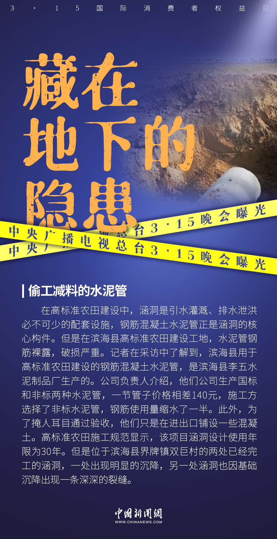 晚會(huì)曝光江蘇省鹽城市濱??h高標(biāo)準(zhǔn)農(nóng)田的地下漏洞,用于建設(shè)的鋼筋混凝土水泥管存在偷工減料問題。施工方選擇了非標(biāo)水泥管,鋼筋使用量縮水了一半。中新財(cái)經(jīng)記者從鹽城市場(chǎng)監(jiān)管局獲悉,工作人員已經(jīng)行動(dòng),后續(xù)信息會(huì)及時(shí)對(duì)外公布。
