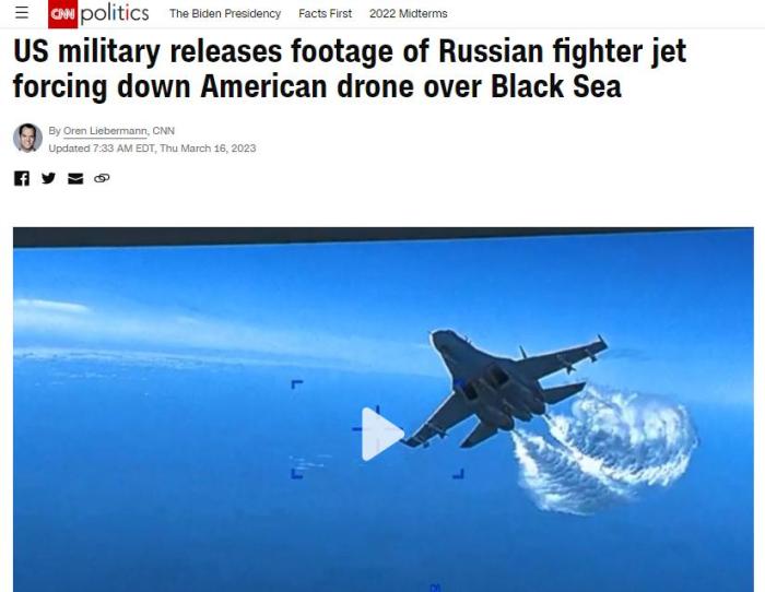 報(bào)道還稱,當(dāng)俄羅斯蘇-27戰(zhàn)斗機(jī)再次靠近時,又一次“傾倒燃料”。隨后,俄羅斯蘇-27戰(zhàn)斗機(jī)與美國MQ-9“死神”無人機(jī)“相撞”,導(dǎo)致螺旋槳受損,無人機(jī)的視頻也由此中斷。不過,CNN同時指出,俄羅斯否認(rèn)發(fā)生了“碰撞”。