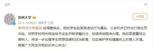 3月19日,蘇州大學(xué)發(fā)布通報(bào):經(jīng)調(diào)查核實(shí),我校學(xué)生趙某某違法行為屬實(shí),公安機(jī)關(guān)已作出行政處罰決定。依照學(xué)校相關(guān)規(guī)定給予該生開(kāi)除學(xué)籍處分,后續(xù)將按程序辦理。我校高度重視立德樹(shù)人,將進(jìn)一步加強(qiáng)學(xué)生思想品德和法治教育,切實(shí)維護(hù)學(xué)校健康向上的育人環(huán)境。感謝廣大網(wǎng)友對(duì)我校的關(guān)心關(guān)注!