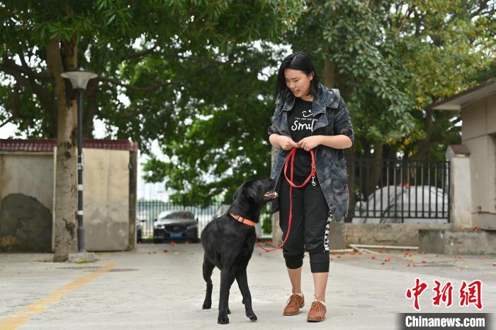 崔靜宜與其訓(xùn)練犬“肉排”互動。 俞靖 攝