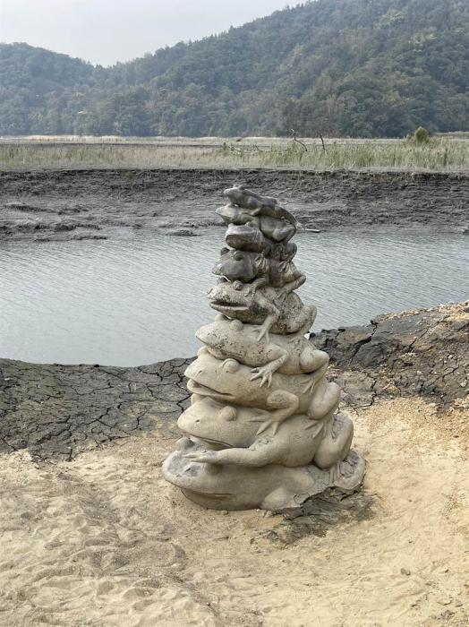 日月潭水位驟降,“九蛙疊像”全部上岸。圖片來源:臺(tái)灣中時(shí)新聞網(wǎng) 楊靜茹 攝