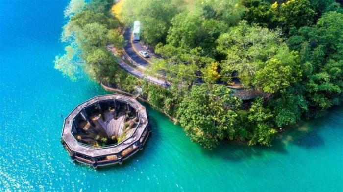 日月潭水位若高于748.5米,過多的水會(huì)從溢流井排到下游溪流;因此溢流井有“日月潭神秘黑洞”之稱。圖片來源:日月潭風(fēng)管處