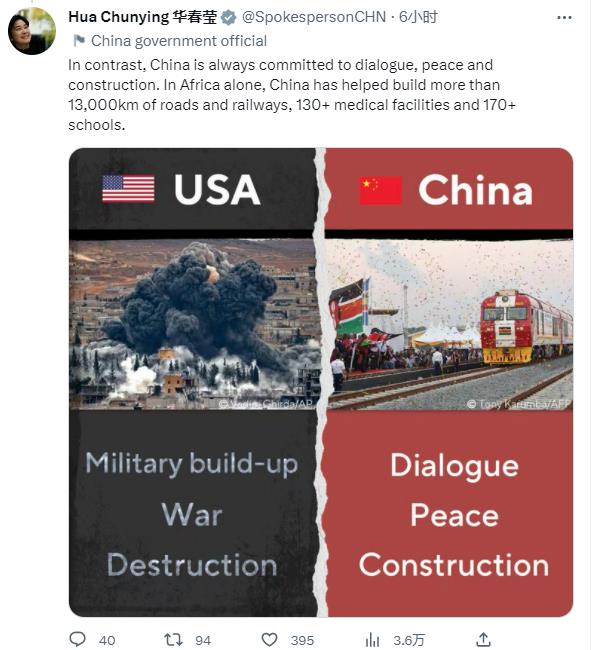 華春瑩接著在第二條推文中發(fā)了一張中美對(duì)比圖,圖中顯示美國(guó)沉迷于軍事建設(shè)、戰(zhàn)爭(zhēng)和破壞?!跋啾戎?,中國(guó)始終堅(jiān)持對(duì)話、和平、建設(shè)。僅在非洲,中國(guó)就援建了1.3萬(wàn)多公里公路和鐵路、130多個(gè)醫(yī)療設(shè)施、170多所學(xué)校?!比A春瑩說(shuō)。