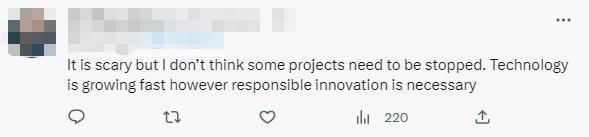 還有人分析,“這很可怕,但我認為有些項目不需要停止。技術(shù)正在發(fā)展迅速,負責(zé)任的創(chuàng)新也是必要的?!?/p>