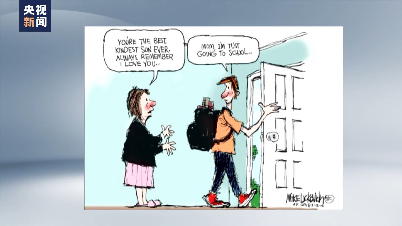 槍支暴力已經(jīng)成為美國孩子的“頭號殺手”。在這幅漫畫中,母親流著眼淚,對準備出門上學的孩子叮囑道,“你是最好、最善良的兒子,永遠要記得這一點,我愛你?!?孩子則有點疑惑地說,“媽媽,我只是去學校?!?這就是校園槍擊案頻發(fā)令無數(shù)父母終日膽戰(zhàn)心驚的真實寫照。