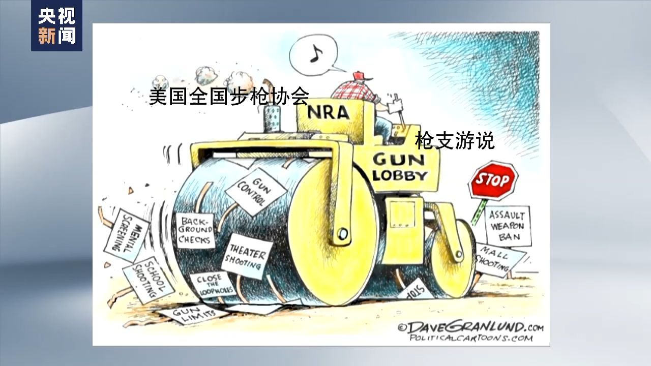 在這幅漫畫中,一名男子聽著音樂,漫不經(jīng)心地開著一輛寫有“美國全國步槍協(xié)會”、“槍支游說”字樣的壓路機一路向前,撞倒了前方赫然在目的“停止”標志。在他身后,“攻擊性武器禁令”、“控槍”、“背景調查”等標志被一一碾壓,接二連三發(fā)生的“校園槍擊”、“劇院槍擊”、“商場槍擊”等慘痛事件也完全被無視。