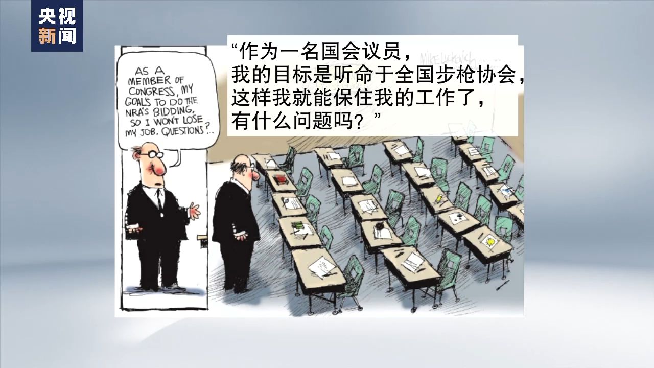 在另一幅漫畫中,在一間寫有“紐敦市一年級”的教室里,擺放著二十張課桌椅,卻唯獨不見孩子的蹤影。漫畫左側,這名來探視的議員心里想的是,“作為一名國會議員,我的目標是聽命于全國步槍協(xié)會,這樣我就能保住我的工作了,有什么問題嗎?”