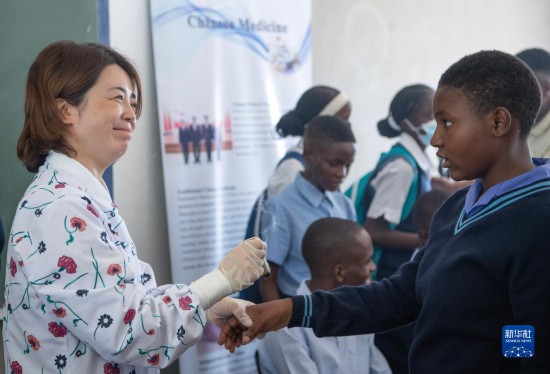 4月3日,在納米比亞溫得和克的伊曼紐爾·謝菲迪中學(xué)課堂上,一名學(xué)生體驗(yàn)針灸。新華社發(fā)(穆薩·卡薩克攝)