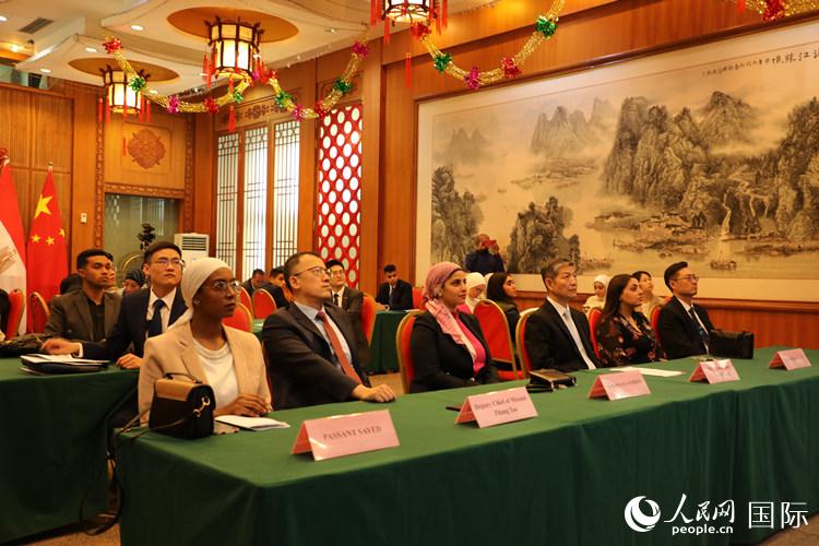 全體與會者共同觀看了阿文版《中國共產(chǎn)黨國際形象網(wǎng)宣片》。使館2名青年外交官代表結合自身工作經(jīng)歷,分別以《從三個關鍵詞讀懂中共二十大重要意義》和《從十年之變看中國式現(xiàn)代化》為題,深入淺出闡釋中共二十大的時代意義和深遠影響,以及中國式現(xiàn)代化對發(fā)展中國家的重要啟示。開羅大學3名師生代表結合自身工作和學習經(jīng)歷,積極分享對中國式現(xiàn)代化的認識和體會,高度評價中國發(fā)展成就,贊賞中國通過“一帶一路”合作助力埃及發(fā)展,表示愿為推動埃中關系進一步發(fā)展貢獻青春力量。