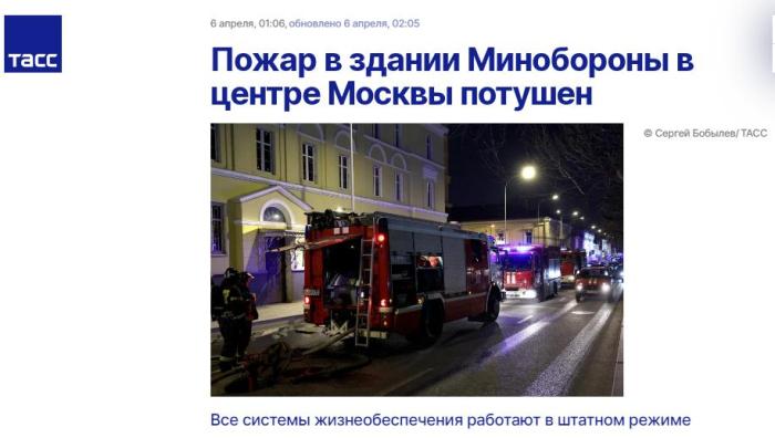 中新網(wǎng)4月6日電 據(jù)塔斯社報(bào)道,當(dāng)?shù)貢r(shí)間5日晚間,俄羅斯國防部位于莫斯科茲納門卡大街的一棟辦公大樓內(nèi)出現(xiàn)起火冒煙的情況,目前火勢已被撲滅,沒有人員受傷。