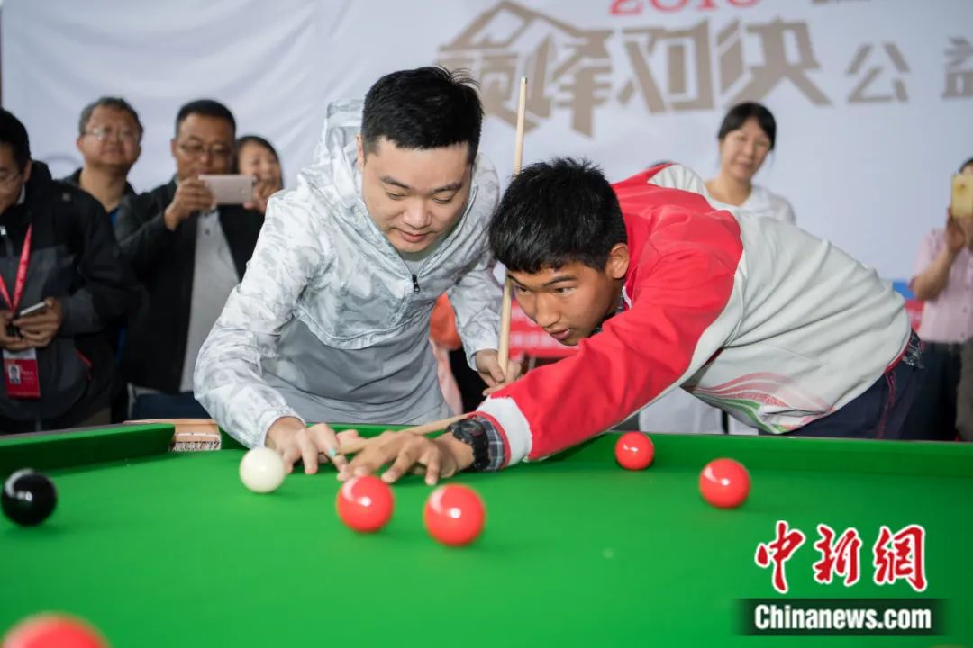 2018“瑞德”斯諾克“巔峰對決”公益活動(dòng)在西藏啟幕,丁俊暉指導(dǎo)藏族學(xué)生打臺球。何蓬磊 攝