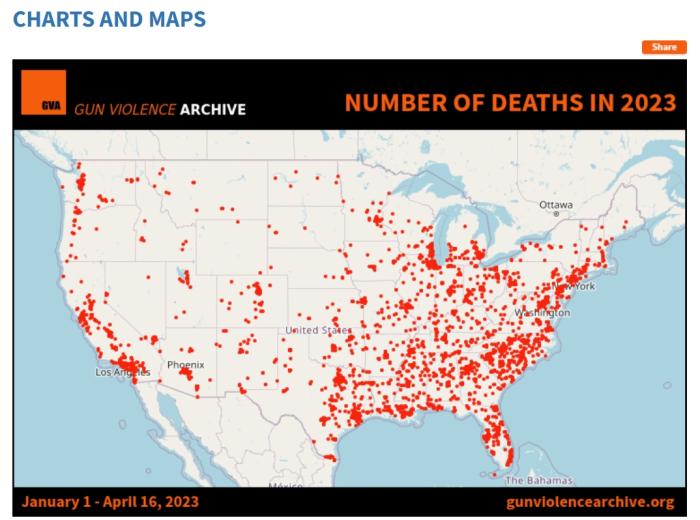 2023年1月1日至4月16日,美國(guó)槍支暴力事件分布圖。圖片來(lái)源:美國(guó)“槍支暴力檔案”網(wǎng)站截圖