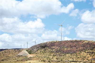 在南非北開普省德阿鎮(zhèn),中國(guó)龍?jiān)措娏瘓F(tuán)南非公司運(yùn)營(yíng)的德阿風(fēng)電項(xiàng)目風(fēng)機(jī)。