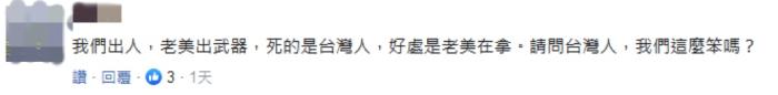 “我們出人,老美出武器,死的是臺(tái)灣人,好處是老美在拿。請問臺(tái)灣人,我們這么笨嗎?”