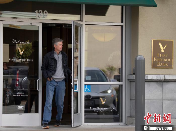 當(dāng)?shù)貢r(shí)間5月1日,一名男子走出位于美國(guó)加州米爾布雷市的一家第一共和銀行。 中新社記者 劉關(guān)關(guān) 攝