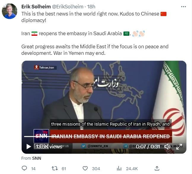 索爾海姆配文提到“伊朗重新開放駐沙特阿拉伯大使館”。他表示,“這是目前世界上最好的消息。為中國外交點贊!”