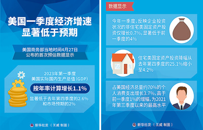 近日,美國商務部經(jīng)濟分析局數(shù)據(jù)顯示,美國2023年一季度GDP年化環(huán)比增長1.1%,大幅低于市場預期的2%,較去年四季度2.6%的增幅有所回落,已連續(xù)兩個季度放緩?!度A爾街日報》網(wǎng)站報道稱,在通貨膨脹仍然高企、利率不斷上升的情況下,美國第一季度經(jīng)濟增長下滑,增加了人們對今年晚些時候可能出現(xiàn)經(jīng)濟衰退的擔憂。