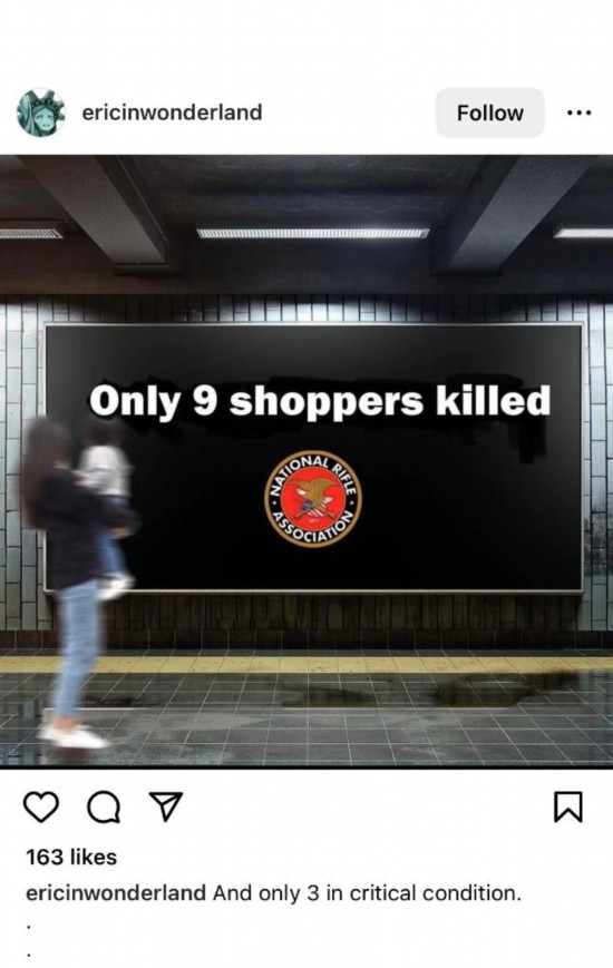 網(wǎng)友Ericinwonderland創(chuàng)作了一則帶有美國(guó)步槍協(xié)會(huì)標(biāo)識(shí)的“廣告”,上面寫道:“只死了9個(gè)。”