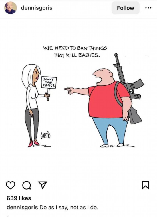 在網(wǎng)友Dennisgoris創(chuàng)作的漫畫中,一名男子指著一名女子說,“我們要禁止殺死嬰兒的政策”,卻無視自己背著的步槍。根據(jù)美國(guó)疾控中心等機(jī)構(gòu)數(shù)據(jù),槍支暴力是美國(guó)兒童和青少年死亡首要原因。
