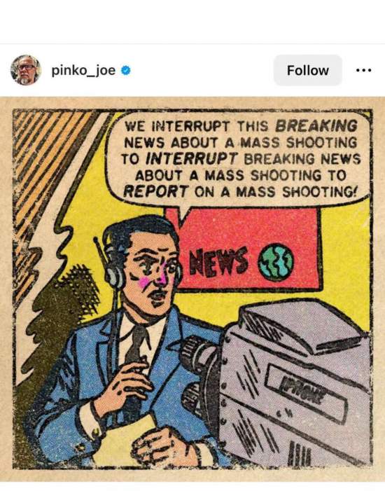 網(wǎng)友Pinko_joe的漫畫主角是一名記者,他對(duì)著鏡頭說:“下面讓我們打斷一下關(guān)于大規(guī)模槍擊的突發(fā)報(bào)道,臨時(shí)插播另一條關(guān)于大規(guī)模槍擊的突發(fā)新聞!”