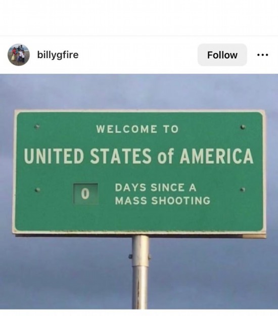 網(wǎng)友Billygfire創(chuàng)作了一塊高速公路廣告牌,上面寫道:“歡迎來到美國(guó),距離上一次大規(guī)模槍擊已經(jīng)過了0天?!?/p>