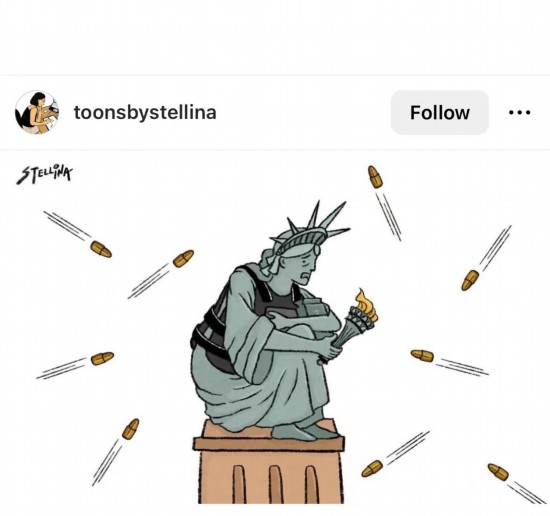 這幅漫畫顯示,面對(duì)來自四面八方的子彈,身穿防彈衣的自由女神抱著膝蓋瑟瑟發(fā)抖。