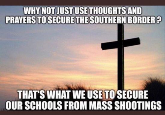 這幅漫畫則諷刺說:“為什么我們不只靠祈禱來阻止非法移民進(jìn)入美國(guó)?我們可是只靠祈禱來保護(hù)學(xué)校不發(fā)生大規(guī)模槍擊?!?/p>