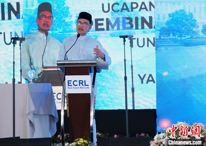 5月12日,馬來西亞東海岸鐵路首個車站開工儀式在吉蘭丹州哥打巴魯舉行。馬來西亞總理安瓦爾出席儀式并致辭。 中新社記者 陳悅 攝