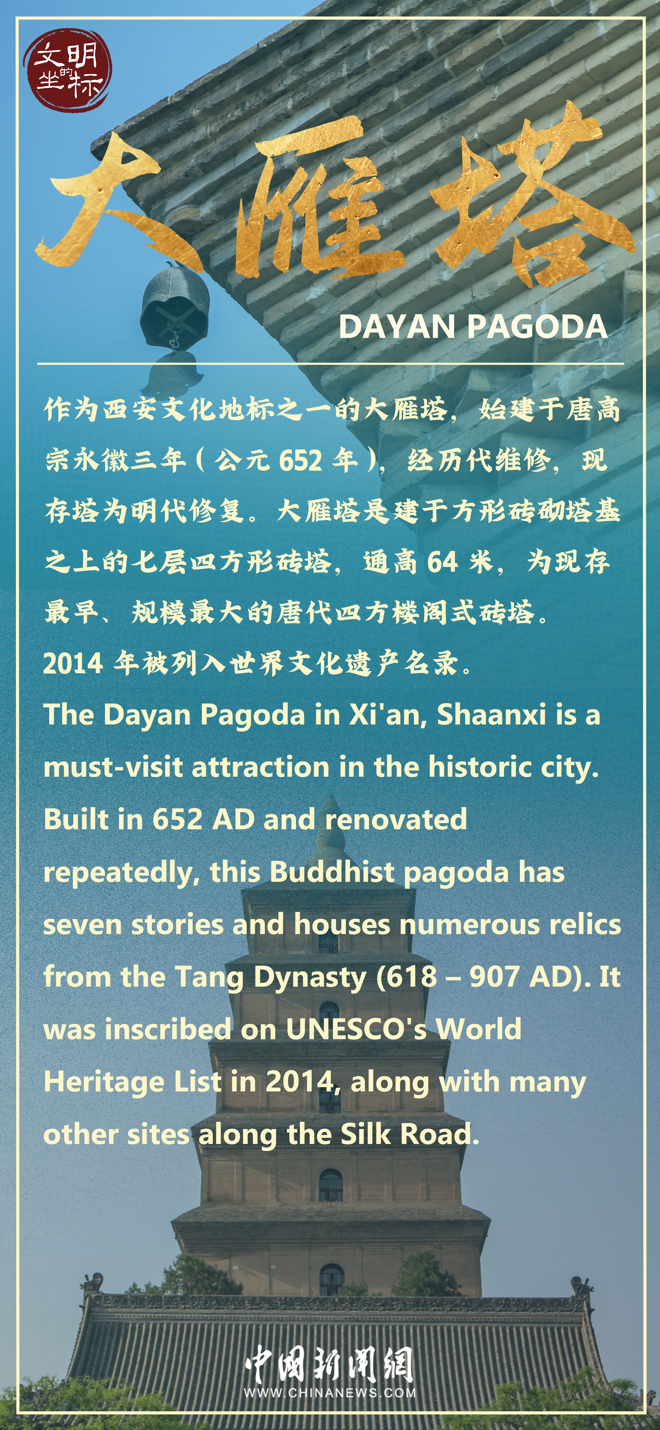 大雁塔又稱大慈恩寺塔,位于陜西省西安市雁塔區(qū),始建于唐高宗永徽三年(公元652年),為七層四方樓閣式磚塔。大雁塔現(xiàn)塔身通高64米,是為保存玄奘法師經(jīng)絲綢之路帶回長安的經(jīng)卷佛像而建,塔下碑文記述和佐證了大雁塔與絲綢之路佛教傳播的歷史。整個建筑氣魄宏大,莊嚴(yán)古樸,是唐代建筑藝術(shù)的杰作。走近大雁塔,感受“塔勢如涌出,孤高聳天宮”的氣勢,觸摸“曲江流飲,雁塔題名”的歷史文脈。